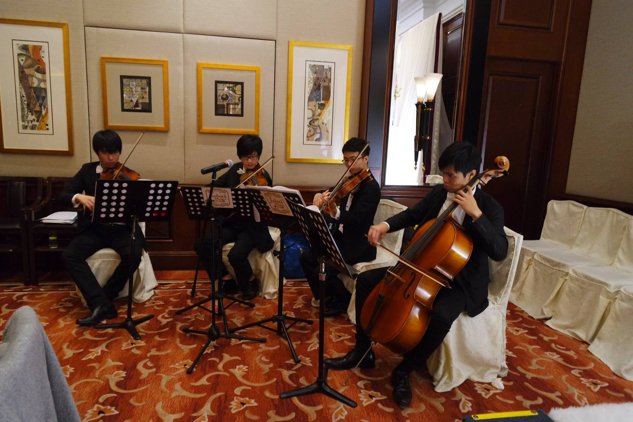 We arranged string quartet to play some classical pop love pieces in their wedding before march in, and play some tango music in the luncheon.