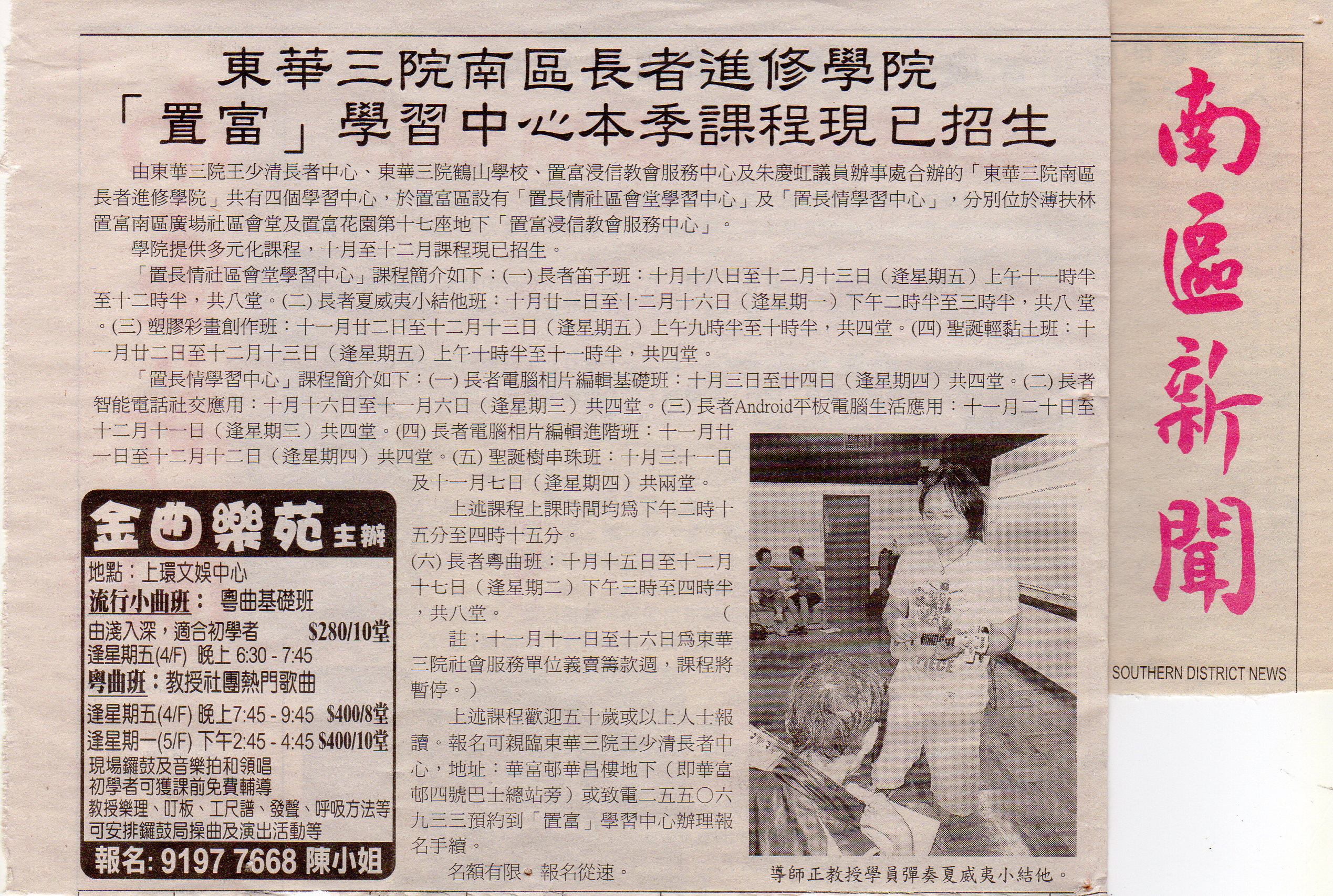 9月24日南區新聞有Jubal Music Academy與東華三院南區長者進修學院合辦的長者Ukulele 班的宣傳