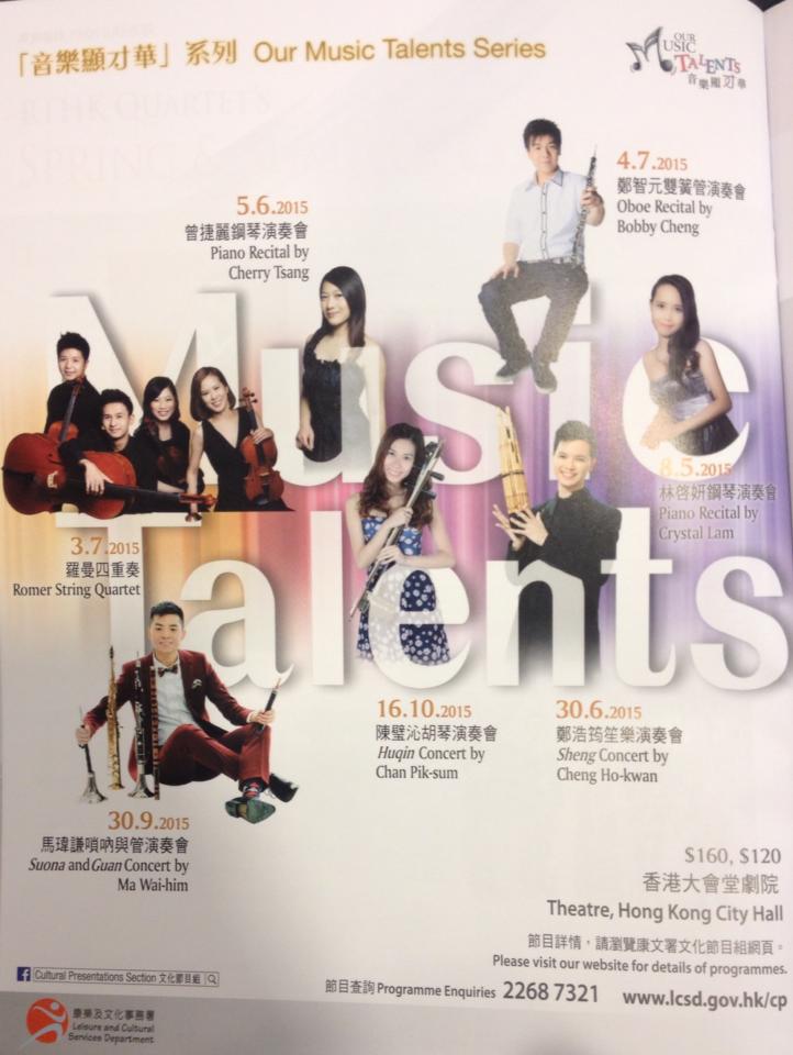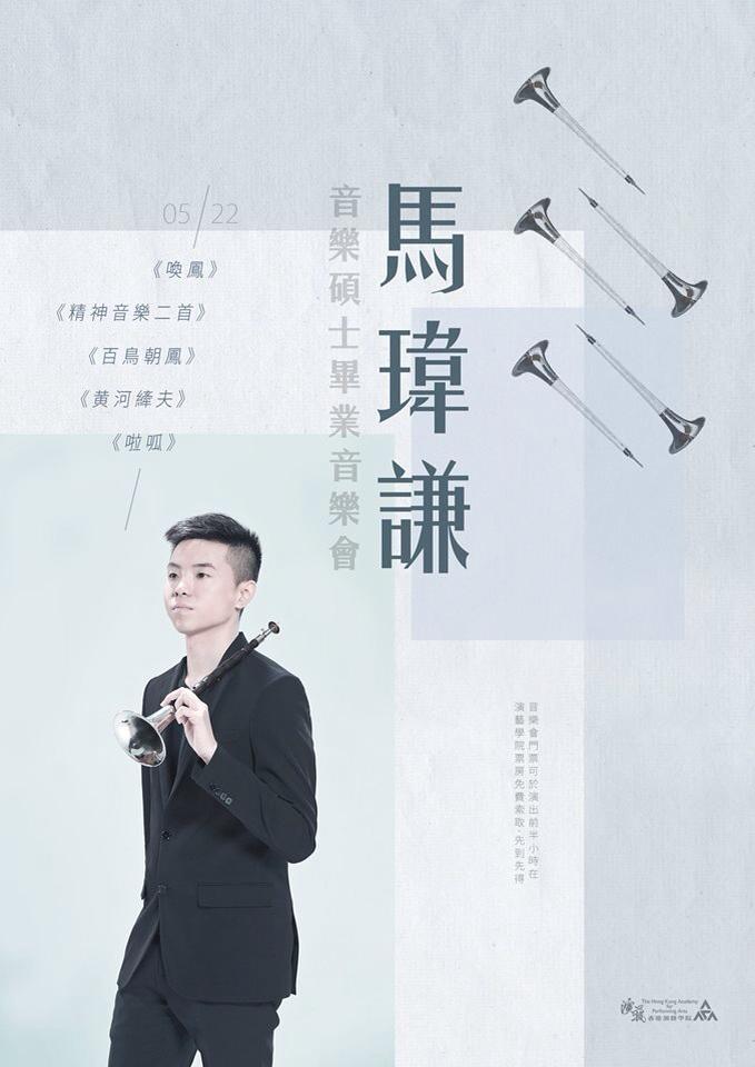 馬瑋謙碩士畢業音樂會(嗩吶、管子) 於2015年5月22日 晚上9時 香港演藝學院音樂廳舉行! 演奏曲目由傳統經典、現代、本土、吹打都應有盡有 節目有嗩吶獨奏《百鳥朝鳳》 、《喚鳳》、《黃河縴夫》、《龍飛鳳舞》、《金不換》、《啦呱》