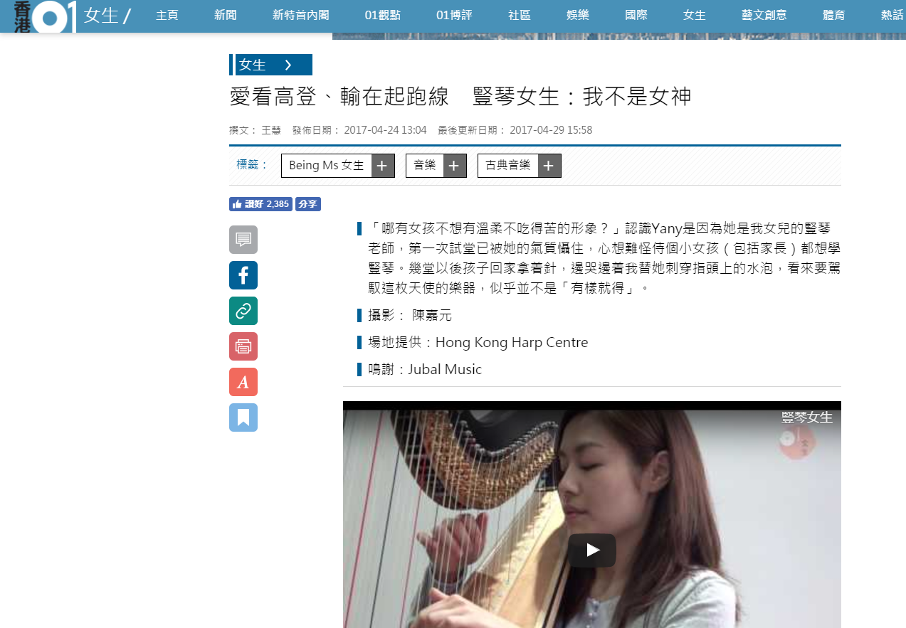 最近她接受了香港O1 的訪問, 訪問連結:愛看高登、輸在起跑線 豎琴女生:我不是女神