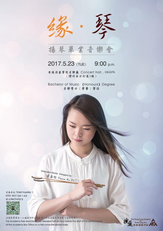 請來支持我們的揚琴音樂家袁嘉怡的畢業音樂會,時間為5月23日晚上9點在香港演藝學院音樂廳舉行。